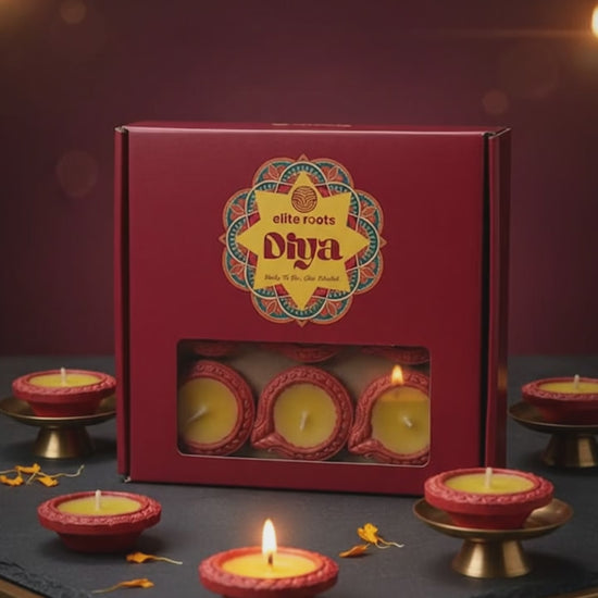 Illuminate your celebrations with the EliteRoots Premium Ghee Blended Diya Box. This exclusive set includes 16 beautifully crafted designer diyas in a striking mehrun finish, pre-filled with pure ghee blend for a clean, long-lasting, and hassle-free flame. Perfect for Diwali, puja rituals, and festive décor, these diyas combine traditional elegance with modern convenience. A ready-to-use, eco-friendly choice that spreads light, warmth, and positivity to every corner of your home.